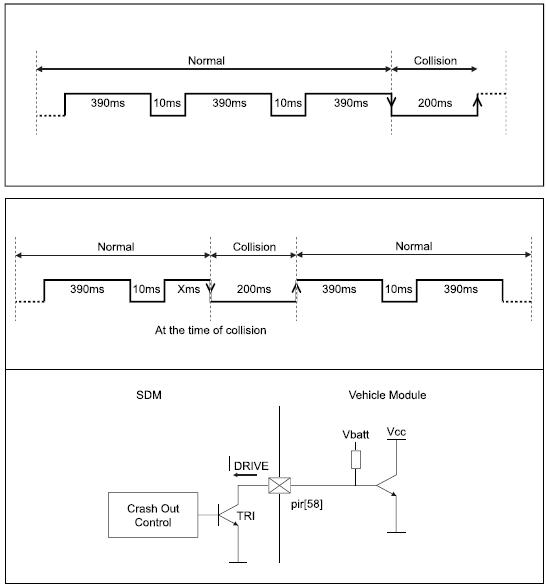 4) 由于大巴的電源波動(dòng),某些公司甚至獨(dú)立配了個(gè)12V備份電源獨(dú)立給電池包內(nèi)配置一個(gè)供電系統(tǒng),所以一般BMU和BMS之間只有CAN線和報(bào)警線之間的關(guān)系了,這里補(bǔ)一個(gè)安全氣囊的PWM報(bào)警輸出口的電路,我個(gè)人覺得其實(shí)BMU和BMS之間在未來需要有一個(gè)額外的通信備份接口,用PWM定義確實(shí)比較合適,在圖里面把Collision改成單體過壓和模組過壓的報(bào)警就可以直接使用了。